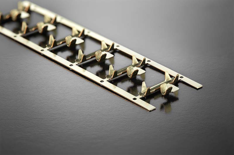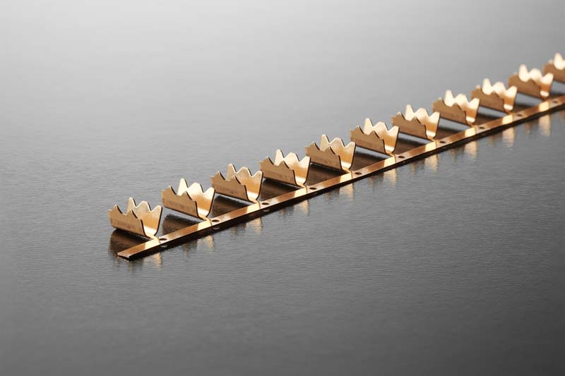 Die Teile werden hier gestanzt und gebogen, wobei eine Anbindung zum Band bestehen bleibt. Lieferung erfolgt aufgespult.